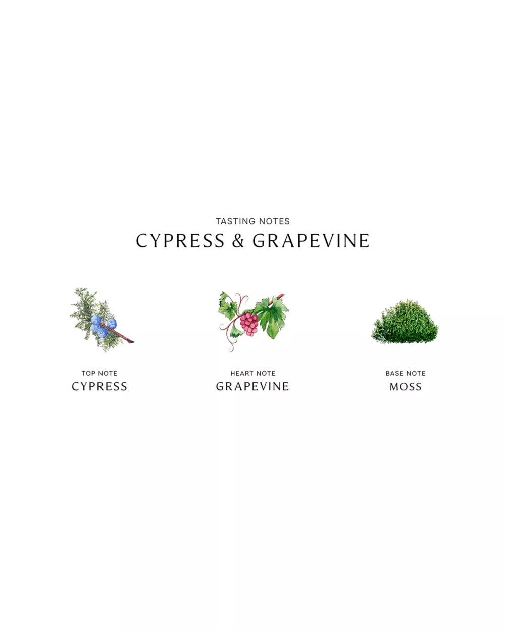 - Top notes: Cypress. This resinous woody note gives the fragrance an aromatic freshness. - Middle notes: Grapevine. A blend of cedarwood and vetiver with warm amber and juicy grape notes. - Base notes: Amber. A note wrapping the scent in woody warmth and imbuing it with sensuality