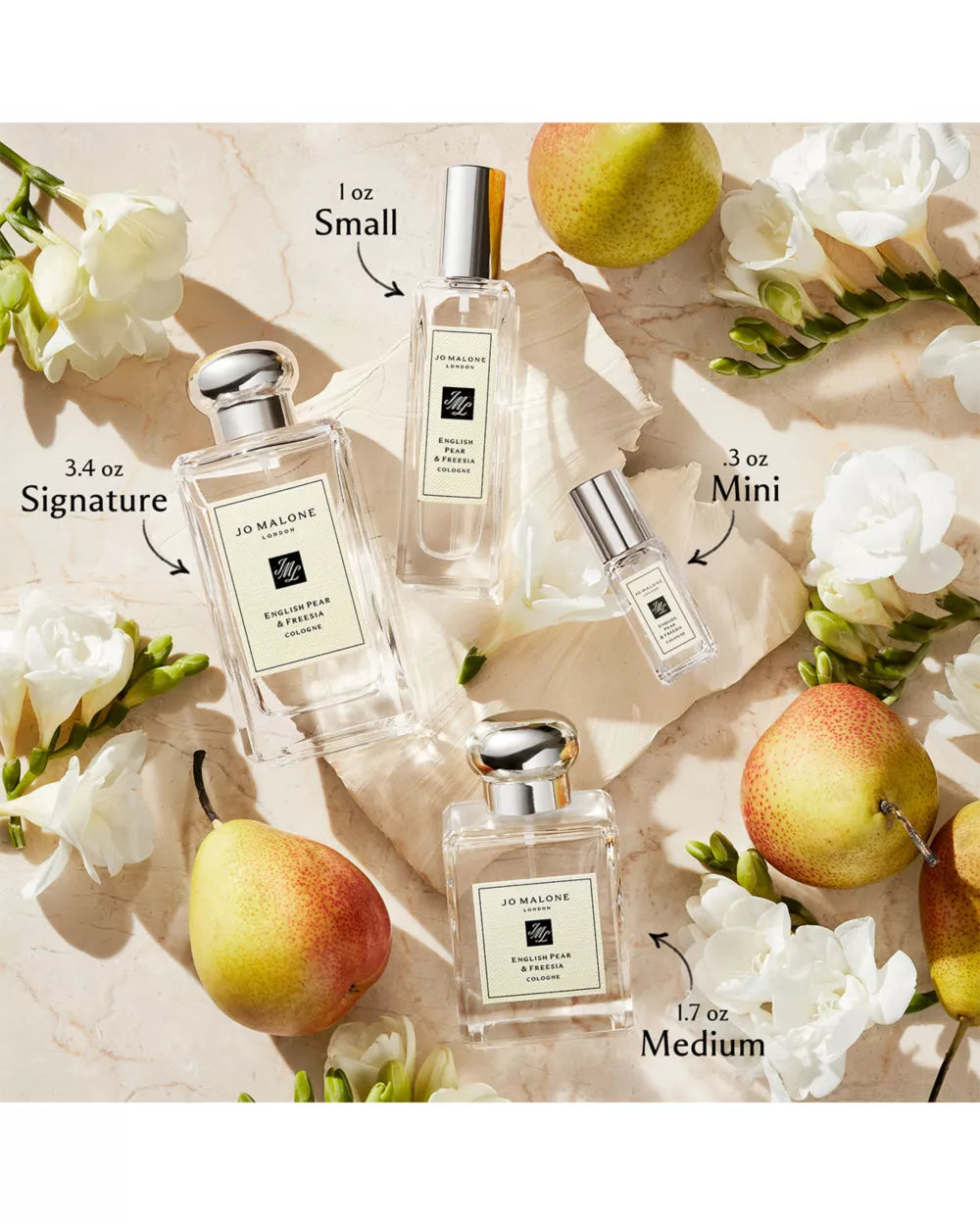 The World of Jo Malone London introduces English Pear & Freesia, a scent that is inspired by a walk in an orchard and captures the luscious scent of just-ripe pears, cooled by the autumn air, ready to twist free from the tree. Experience the surprising, sensuous freshness of sweet pears, wrapped in a bouquet of white freesias, on a subtle background of scrambling wild roses and skin-warming amber, patchouli and woods. Top note: William PearAn unusual, innovative ingredient, this accord of mellow scented fruit is fresh and ripe with a juicy facet. Middle note: FreesiaQuintessentially English, cool white freesias imbue the heart of the fragrance with a delicate yet distinctive scent. Base note: PatchouliA sensuously deep, woody note that enhances the longevity of the fragrance.