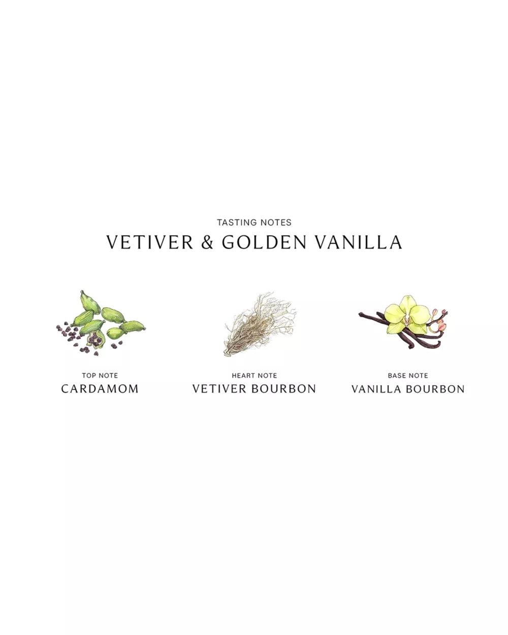 - Top notes: Cardamom - Middle notes: Vetiver Bourbon - Base notes: Vanilla Bourbon